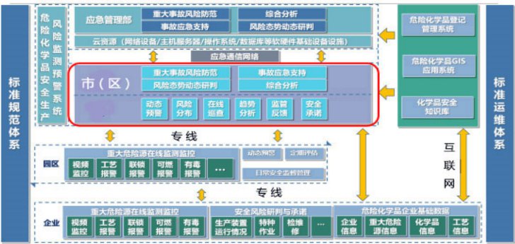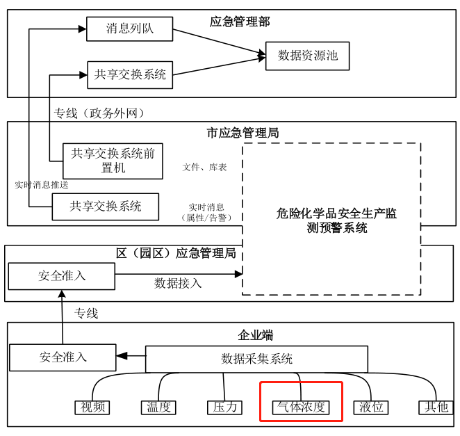根據(jù)應(yīng)急管理部相關(guān)建設(shè)指南要求,危險化學(xué)品安全生產(chǎn)風(fēng)險監(jiān)測預(yù)警系統(tǒng)利用數(shù)據(jù)采集設(shè)備,依托專線接入企業(yè)重大危險源的實(shí)時監(jiān)測數(shù)據(jù)和視頻監(jiān)控數(shù)據(jù)等,總體架構(gòu)設(shè)計包括應(yīng)急管理部、市(區(qū))應(yīng)急管理部門、化工園區(qū)(以下簡稱園區(qū))、企業(yè)四級,系統(tǒng)建成后分別集成至上海市應(yīng)急管理綜應(yīng)用平臺和部級應(yīng)急管理大數(shù)據(jù)應(yīng)用平臺。危險化學(xué)品安全生產(chǎn)風(fēng)險監(jiān)測預(yù)警系統(tǒng)總體架構(gòu)如圖 1 所示。